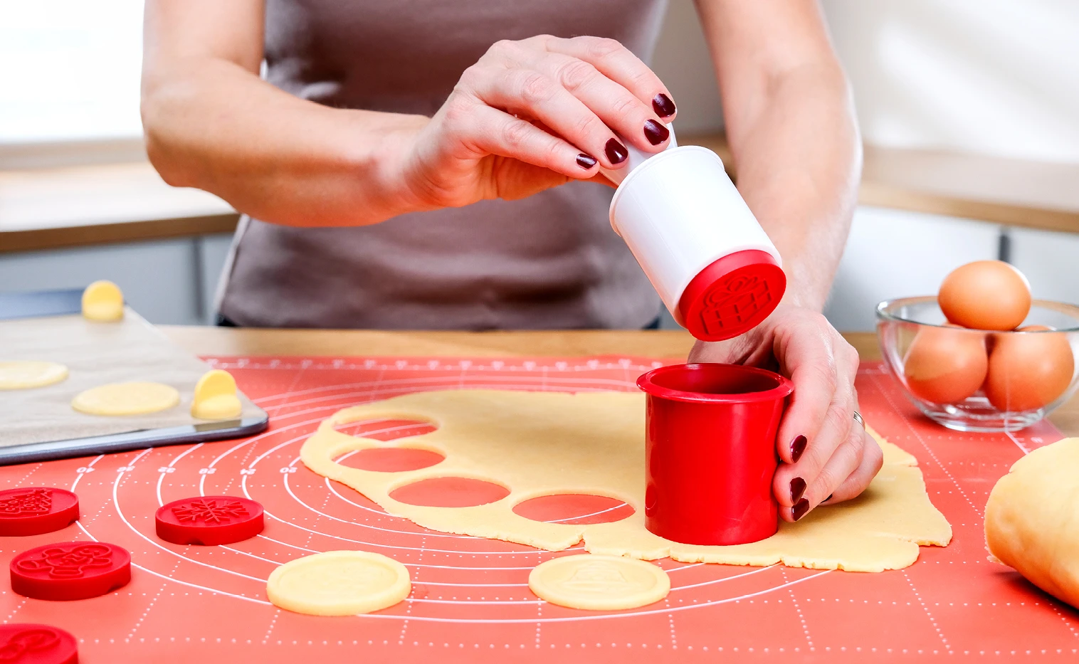 Misture todos os ingredientes, prepare uma massa homogénea e deixe descansar no frigorífico por pelo menos 2 horas. Abra a massa com um rolo. Use o cortador para moldar os biscoitos e asse no forno a 160 °C por cerca de 10 a 12 minutos.Dica: utilize um tapete em silicone para preparar as bolachas, este adere perfeitamente à banca da cozinha e impede que a massa cole na superfície de trabalho.