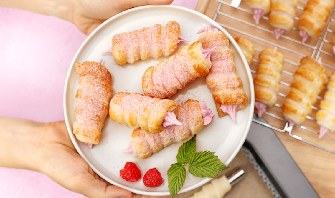 De seguida, prepare o creme. Aqueça a água numa panela pequena em fogo médio, coloque uma tigela em inox para aquecer em banho-maria e, aos poucos, incorpore os dois tipos de açúcar às claras batidas em castelo. Bata a massa resultante com uma batedeira em velocidade baixa até obter um creme liso. Por fim, incorpore aos poucos o pó de framboesa para que o creme fique com uma cor uniforme. Recheie os rolinhos arrefecidos usando um saco decorador.