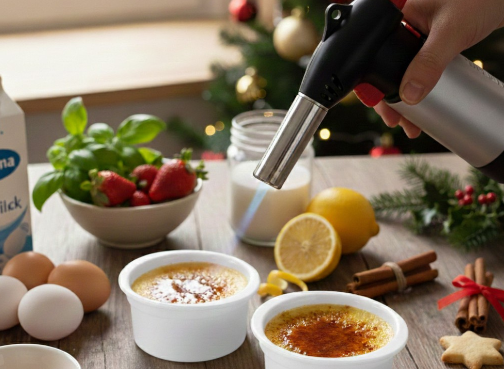 Na hora de servir, polvilhe uma camada fina de açúcar sobre cada porção. Use o queimador de leite creme para derreter e caramelizar o açúcar até formar uma casca dourada e crocante.