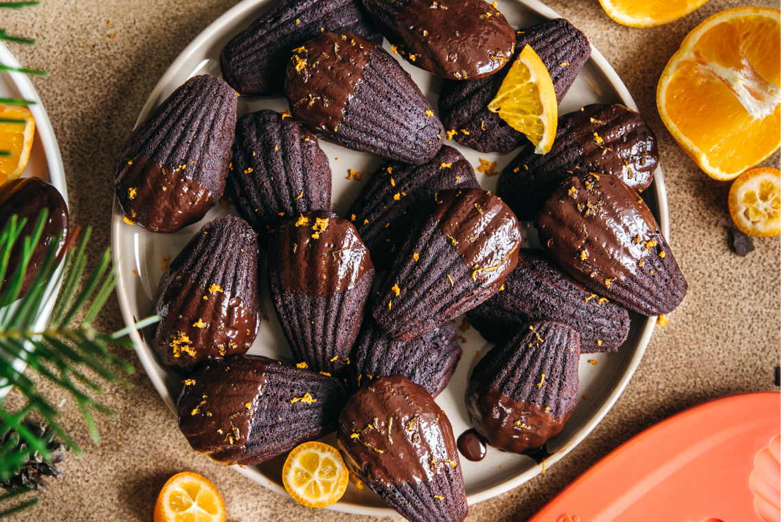 Bata os ovos e o açúcar num liquidificador ou com uma batedeira até obter uma mistura leve e fofa, depois reduza a velocidade para baixa e adicione lentamente o sumo de laranja, as raspas, o leite e o extrato de baunilha. Numa segunda taça, peneire a farinha, o cacau, o sal e o fermento em pó e incorpore gradualmente a mistura à massa preparada. Adicione a manteiga derretida e incorpore-a cuidadosamente com uma espátula. Embrulhe a taça em papel de alumínio e leve ao frigorífico por pelo menos 3 horas, de preferência durante a noite. Pré-aqueça o forno a 180 °C e unte a forma de madalenas com manteiga. Misture a farinha e o cacau numa taça, polvilhe levemente a forma untada com a mistura e coloque a forma no frigorífico por 10 minutos. Adicione uma colher de chá e meia da massa à forma arrefecida. Não é necessário alisar a massa. Asse por 10 minutos, as madalenas devem ficar ligeiramente convexas.Para a cobertura, derreta o chocolate picado junto com a manteiga em banho maria e mergulhe as madalenas individualmente, por fim rale a casca da laranja e deixe solidificar.