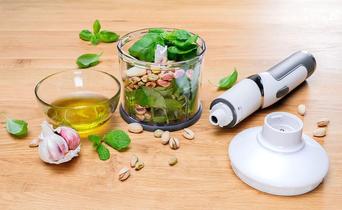 Coloque todos os ingredientes do pesto no copo da varinha mágica ou use um liquidificador e triture rapidamente. Adicione o sumo de limão e a pimenta, e bata novamente por alguns instantes. Por fim, adicione sal a gosto (se usou pistácios salgados, não será necessário).Para preparar esta receita vai precisar dos seguintes utensílios de cozinha: