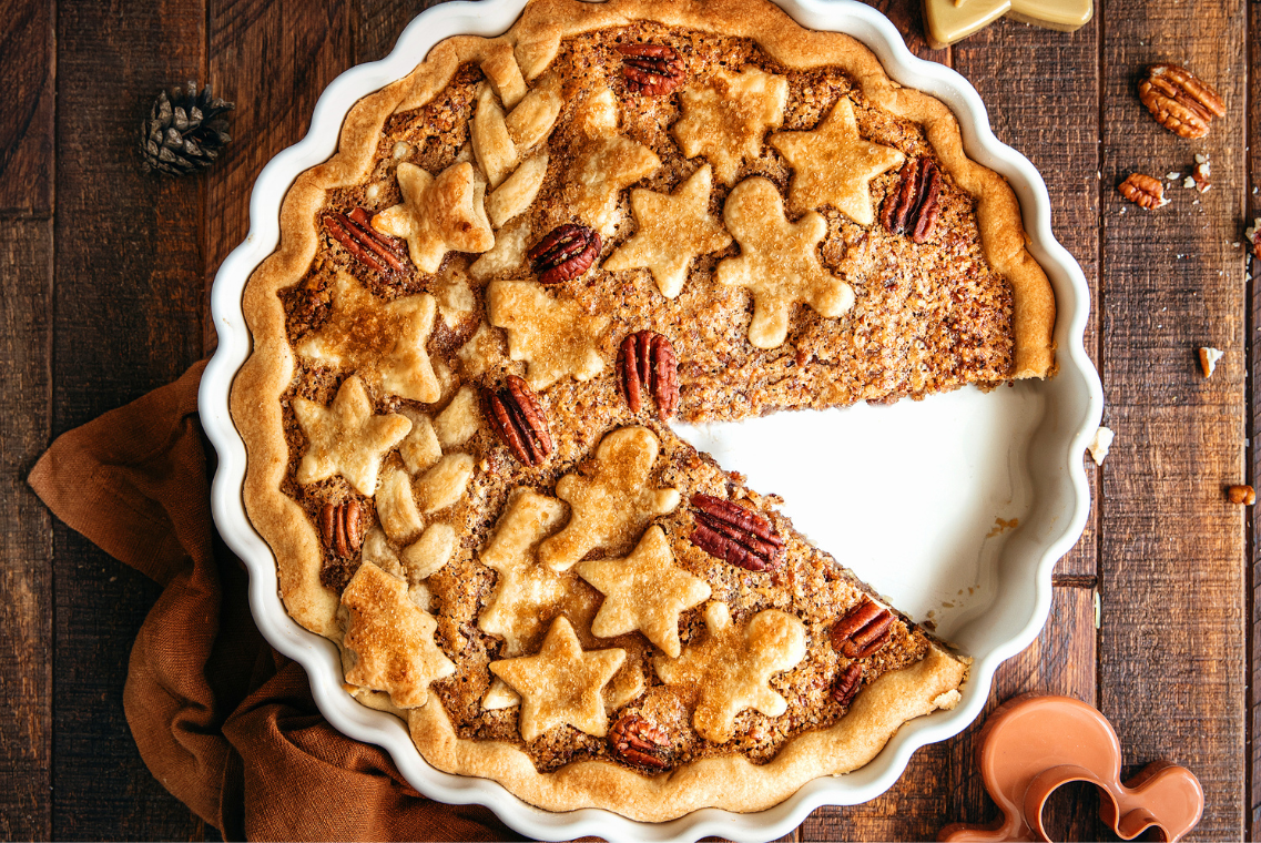 Verta o recheio sobre a base fria, decore com as formas recortadas e espalhe as metades de nozes pecan por cima. Leve ao forno durante cerca de 45 minutos, até a superfície dourar. Deixe arrefecer antes de servir.